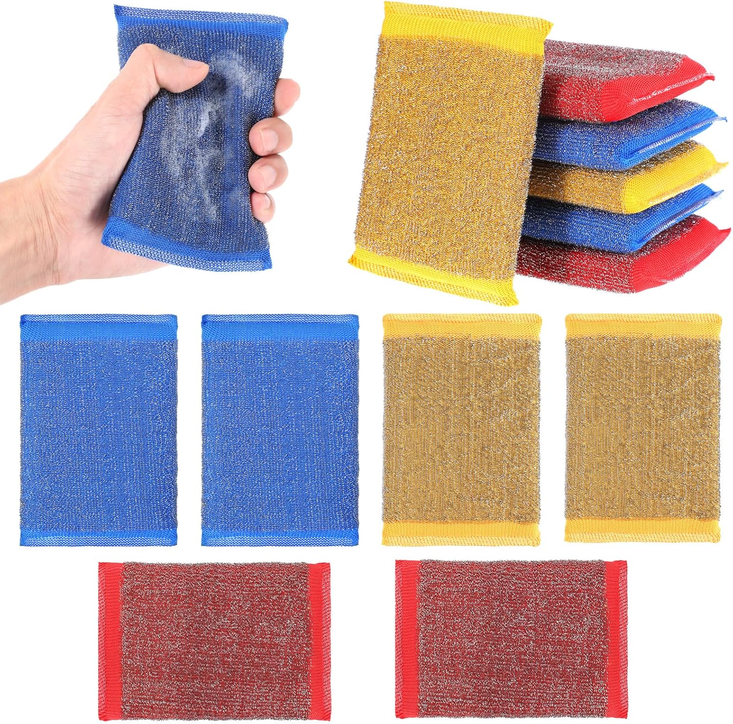 • Practical Set: This set includes six multicolored metal kitchen sponges in yellow, blue, and red, allowing you to assign different colors for specific tasks, ensuring hygiene and organization in your home